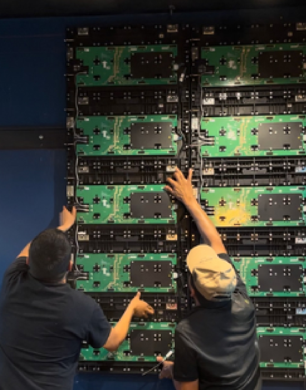 Instalación de la pantalla por módulos, integración eléctrica y calibración de imagen.